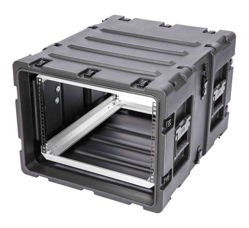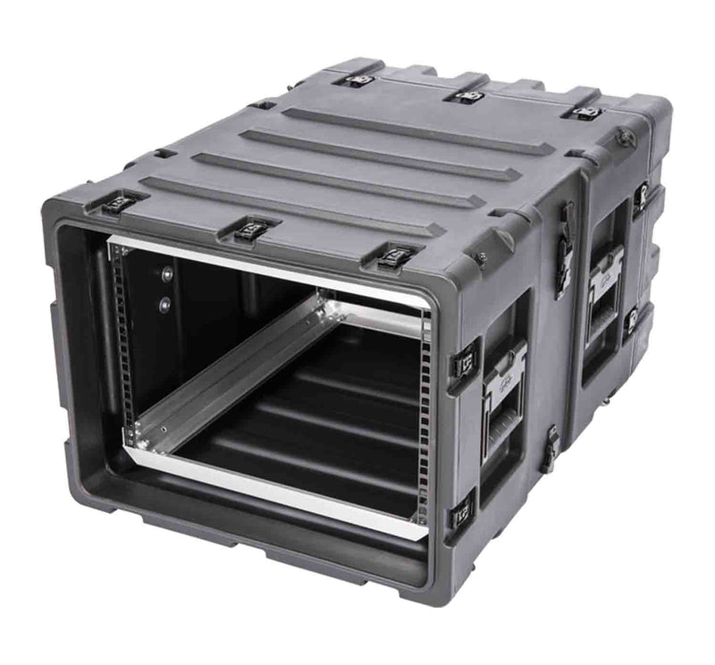 Molded of LMDP Linear Medium Density Polyethylene plastic that meets or exceed MIL-STD 810G standards and includes 8 elastomeric shock absorbers which allows a standard payload range of 40 to 150 pounds. Optional extended payload range of 160 to 300 pounds can be accommodated as a special-order option. The 3RS Series Static Shock Racks are available in 24” or 30” deep from rail to rail with a standard 19” rack width per ANSI/EIA-310-C specification and feature square-hole rack rails to accommodate either #10-32 US standard, or 6mm International standard cage nuts which are supplied with the cases.