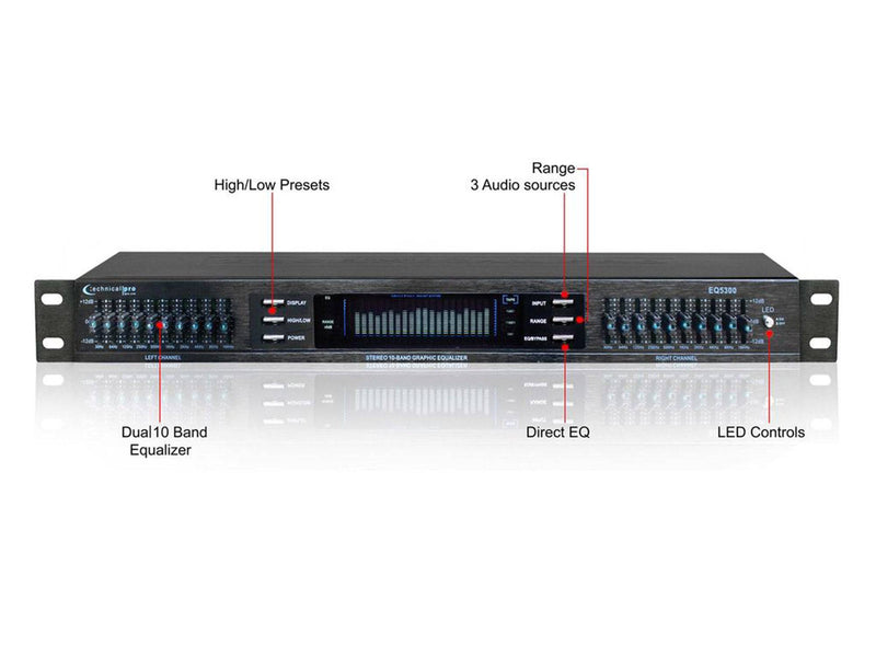 The EQ5300 is the ultimate tool for sound professionals and hi-fi sound enthusiasts looking to enhance their audio system. Boasting two channels, the EQ5300 can take input from up to three sources via the integrated RCA inputs. Equalization points are spread out over the whole spectrum of human hearing to give you the ability to boost and cut output wherever the sound takes you from highs to lows.