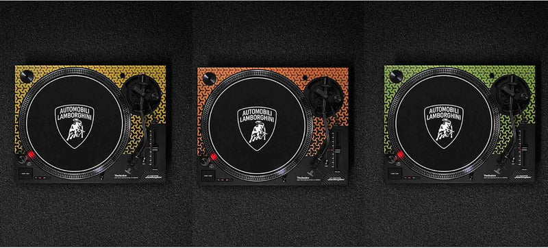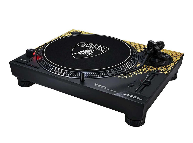 The Technics SL-1200M7B Direct Drive Turntable System Special Edition is inspired by Automobile Lamborghini's iconic Y-shape pattern. the SL-1200 Series offers the SL-1200M7B, a collaboration between Technics and Lamborghini that brings together the brands' concepts and sound-making initiatives. Includes a vinyl record featuring the engine sounds of flagship Lamborghini cars, a slipmat, and stickers with exclusive designs, plus the highest possible sound quality and wide-ranging DJ functions.
