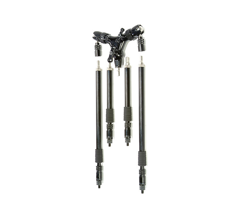 The Triad-Orbit O2X, Dual Arm Orbital Boom with Interchangeable Arms Providing you with the option of multiple boom lengths, the Orbit 2X Dual Orbital Boom System from Triad-Orbit includes 2 IO-A1 boom arms and 2 IO-A2 boom arms. The IO-A1 booms have an adjustable length of 9.5 to 12.5", while the IO-A2 boom arms can be adjusted between 15.5 to 24.75". They all feature IO quick-change couplers for quick swapping. The system incorporates the company's Micro Orbital adapters which provide 360°x230° range of motion and a center swivel range of motion of 150°.