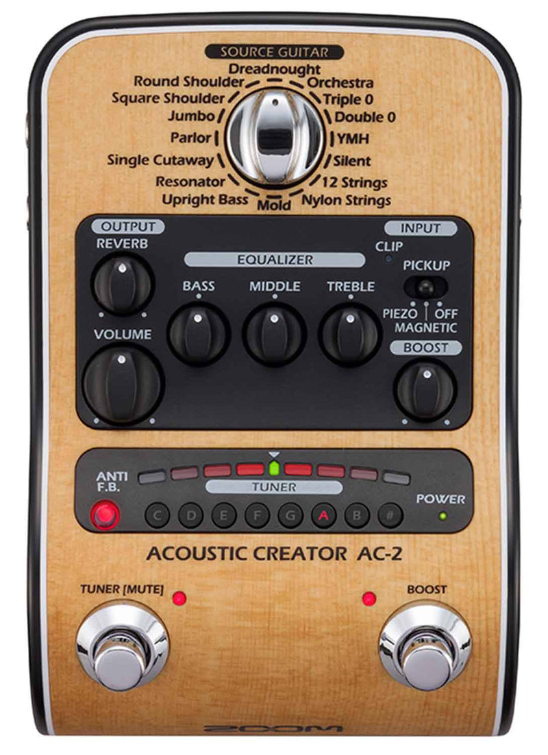 Amplify your acoustic sound with the Zoom AC-2 Acoustic Creator. The AC-2 is a DI direct box that encompasses all you need to deliver a natural guitar tone on stage or in the studio. The AC-2 automatically restores tone lost through acoustic pickups, so your sound is always lush, resonant, and faithful to the instrument you have in hand.